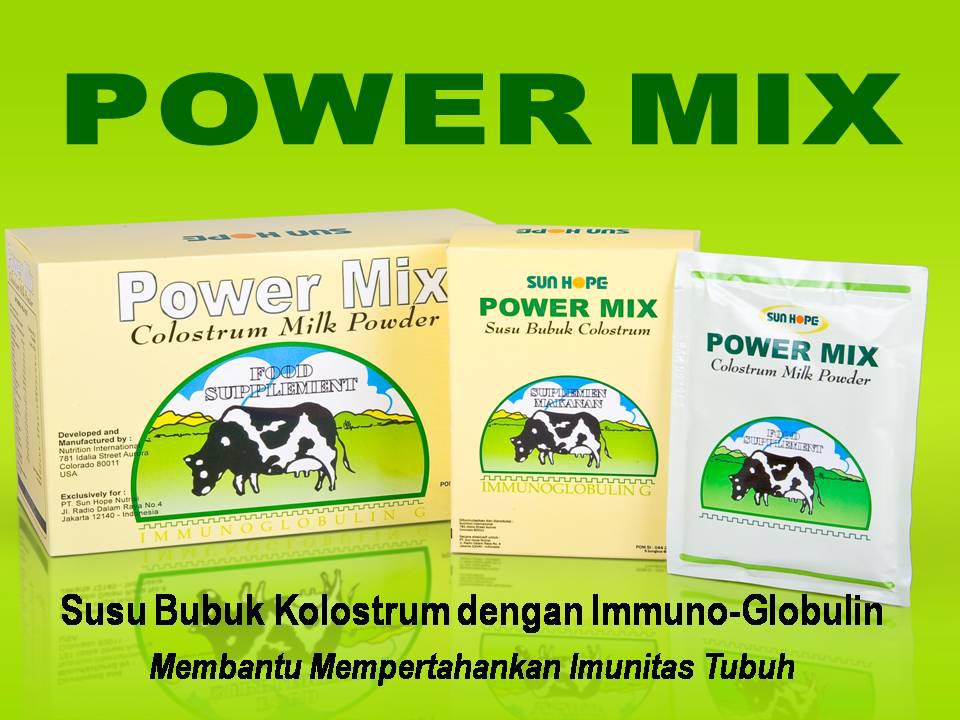 Power Mix merupakan produk susu bubuk kolestrum dengan Immuno-Globulin. Dibuat dari sapi pilihan, produk ini mampu meningkatkan sistem kekebalan tubuh